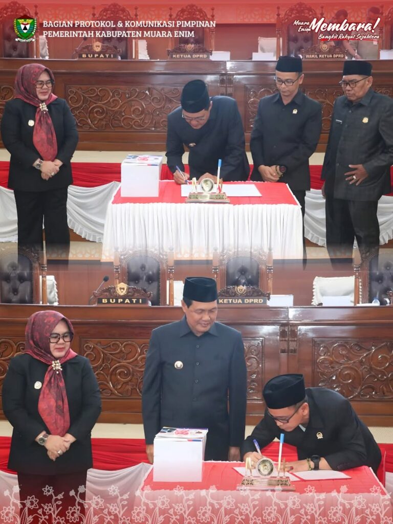 Muara Enim – Bupati Muara Enim H. Edison, S.H., M.Hum., menyerahkan Dokumen Laporan Keterangan Pertanggungjawaban (LKPJ) Bupati Muara Enim Tahun 2025 pada Rapat Paripurna ke-II DPRD Kabupaten Muara Enim, Selasa (31/03/26).