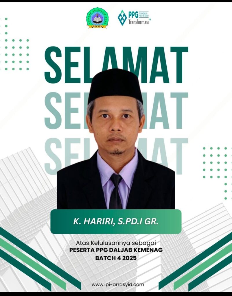 SUMENEP — Kabar membanggakan datang dari dunia pendidikan Kecamatan Rubaru. Salah satu guru dari Yayasan Ar-Rasyid Duko, K. Hariri, S.Pd.I., Gr., resmi dinyatakan lulus sebagai peserta Pendidikan Profesi Guru (PPG) Dalam Jabatan (Daljab) Kementerian Agama Batch 4 Tahun 2025.