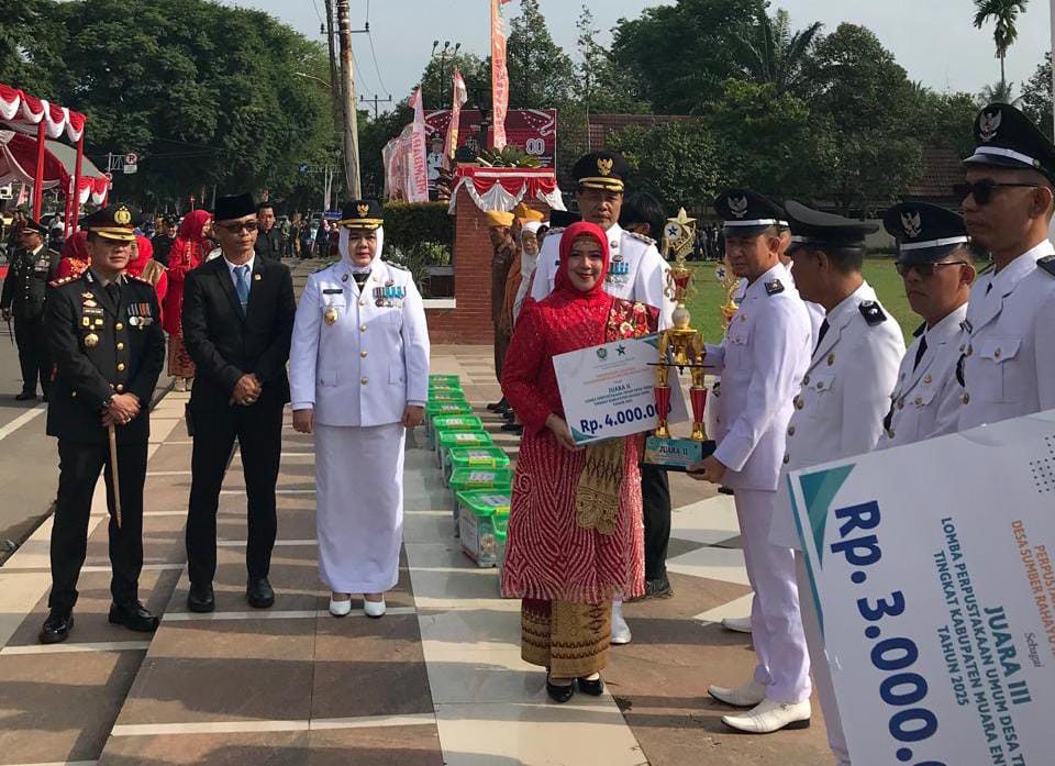 Muara Enim – Kepala Desa Keban Agung hadiri upacara detik detik proklamasi Hari Ulang Tahun Republik Indonesia (HUTRI Ke-80) sekaligus terima penghargaan lomba perpustakaan terbaik 2 tingkat Kabupaten Muara Enim di Lapangan Merdeka Muara Enim. Minggu (17/08/25).