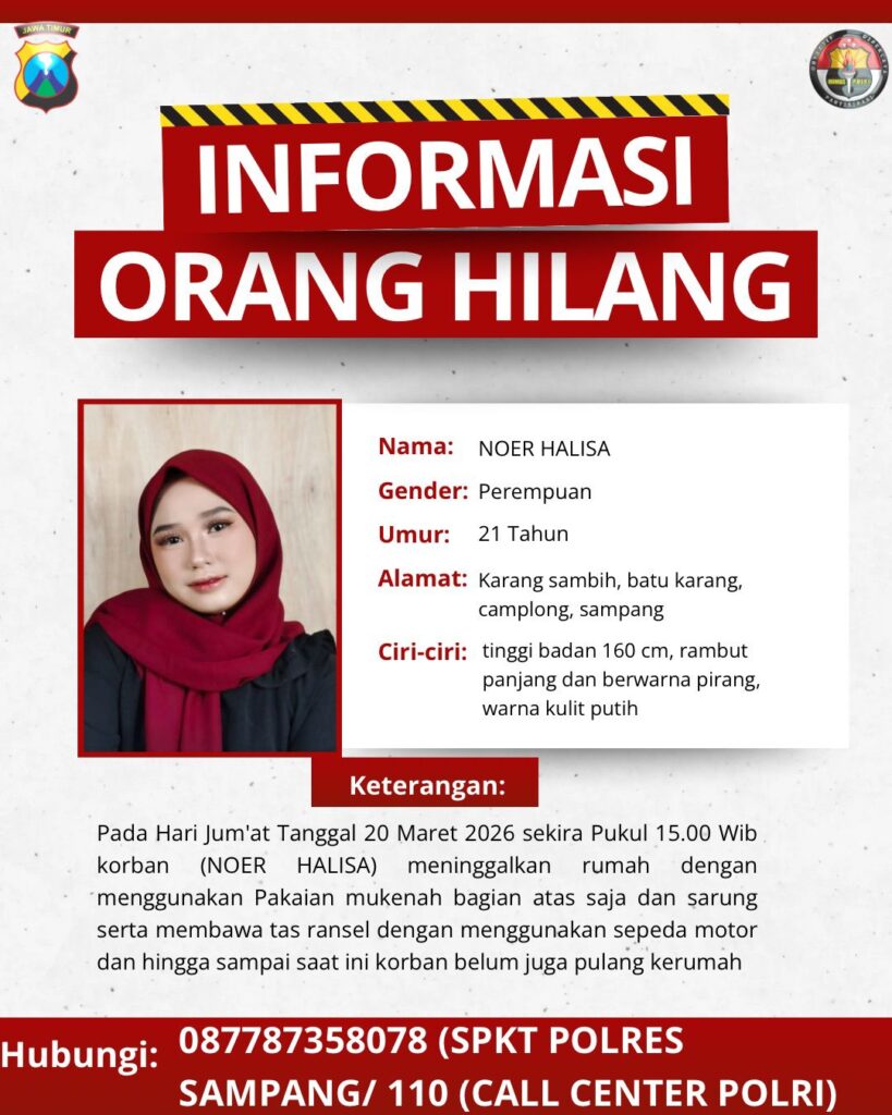 Sampang, Jawa Timur – Seorang mahasiswi bernama Noer Halisa (21) dilaporkan hilang setelah meninggalkan rumahnya pada Jumat, 20 Maret 2026, sekitar pukul 15.00 WIB.