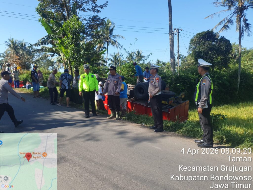 Bondowoso-,Sebuah truk terguling di jalur alternatif Bondowoso-Jember, di desa Grujugan Kidul Kecamatan Grujugan Kabupaem Bondowoso. Truk tak bisa mengendalikan kemudi saat bepapasan dengan motor, di jalur tanjakan berkelok hingga terjun ke sawah.