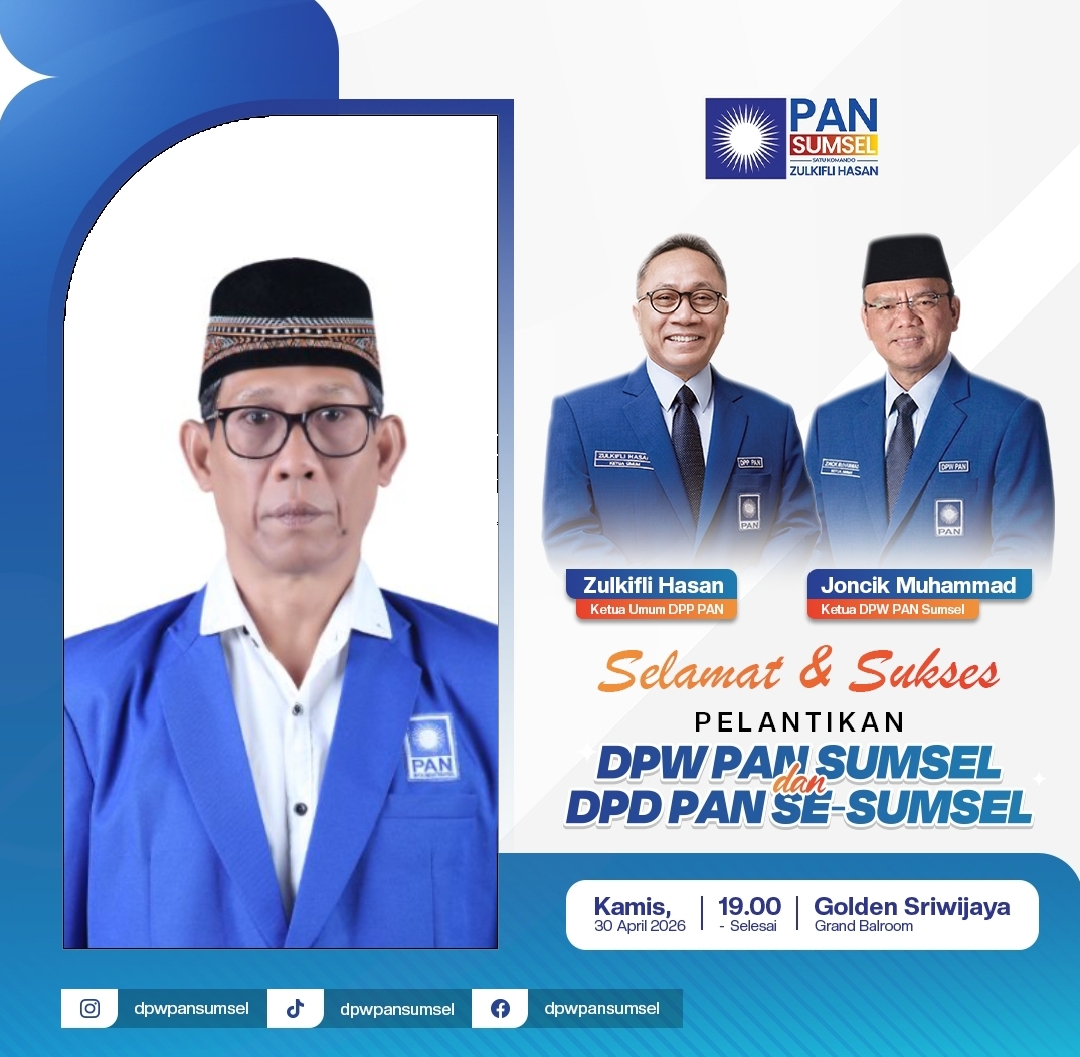 Sumsel, SeputarNegeri.my.id – Ketua Fraksi PAN DPRD PALI, Tutut Sapriyono, menyampaikan ucapan selamat dan sukses atas pelantikan kepengurusan DPW PAN Sumatera Selatan dan DPD PAN se-Sumsel yang dijadwalkan berlangsung pada Kamis, 30 April 2026, di Golden Sriwijaya Grand Ballroom, Palembang.
